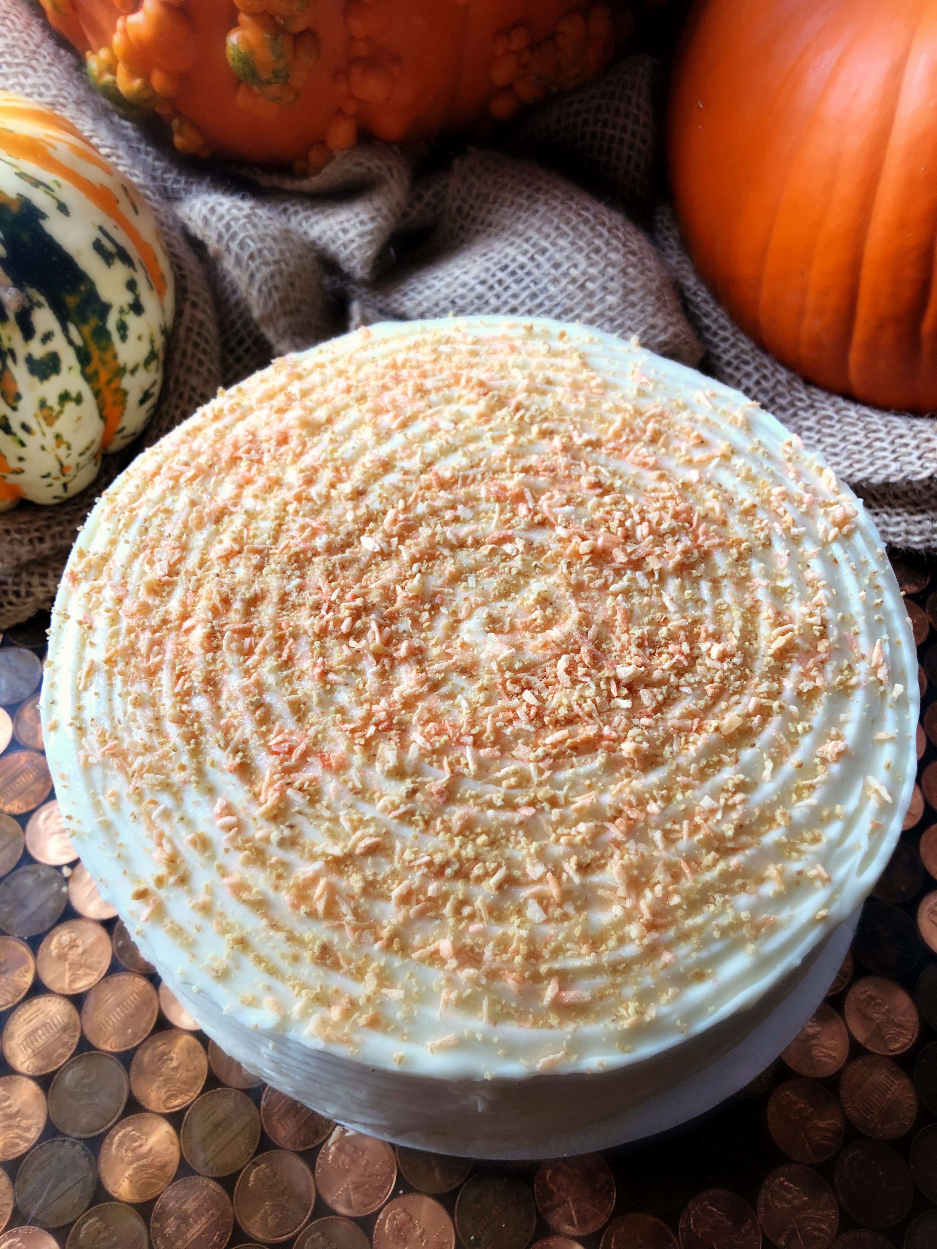 Details, details, we have 'em right here for you. Our Sweet Cream Ice Cream gets sandwiched between addicting salted caramel sauce and layers of delectable, moist pumpkin cake. Then, the whole dang thing gets shmothered in a blanket of our delightful cream cheese frosting! Garnished with toasted coconut, boxed, and boom-- your centerpiece dessert is ready to be devoured.
